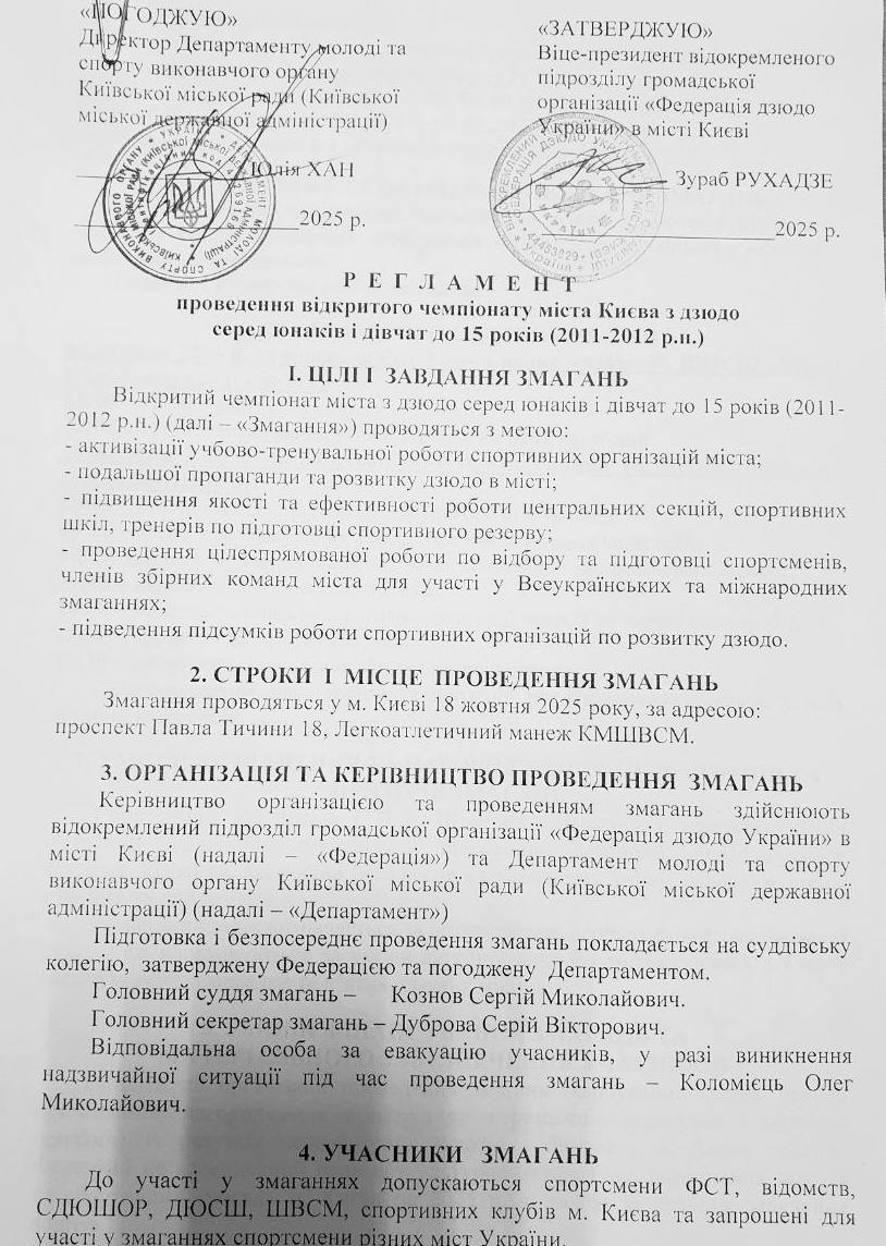 Регламент відкритого чемпіонату міста Києва з дзюдо серед юнаків та дівчат до 15 років (2011-2012 р.н.)