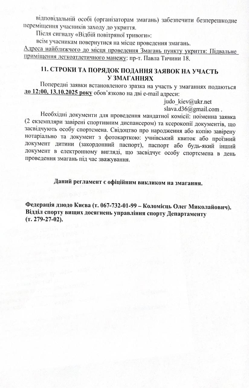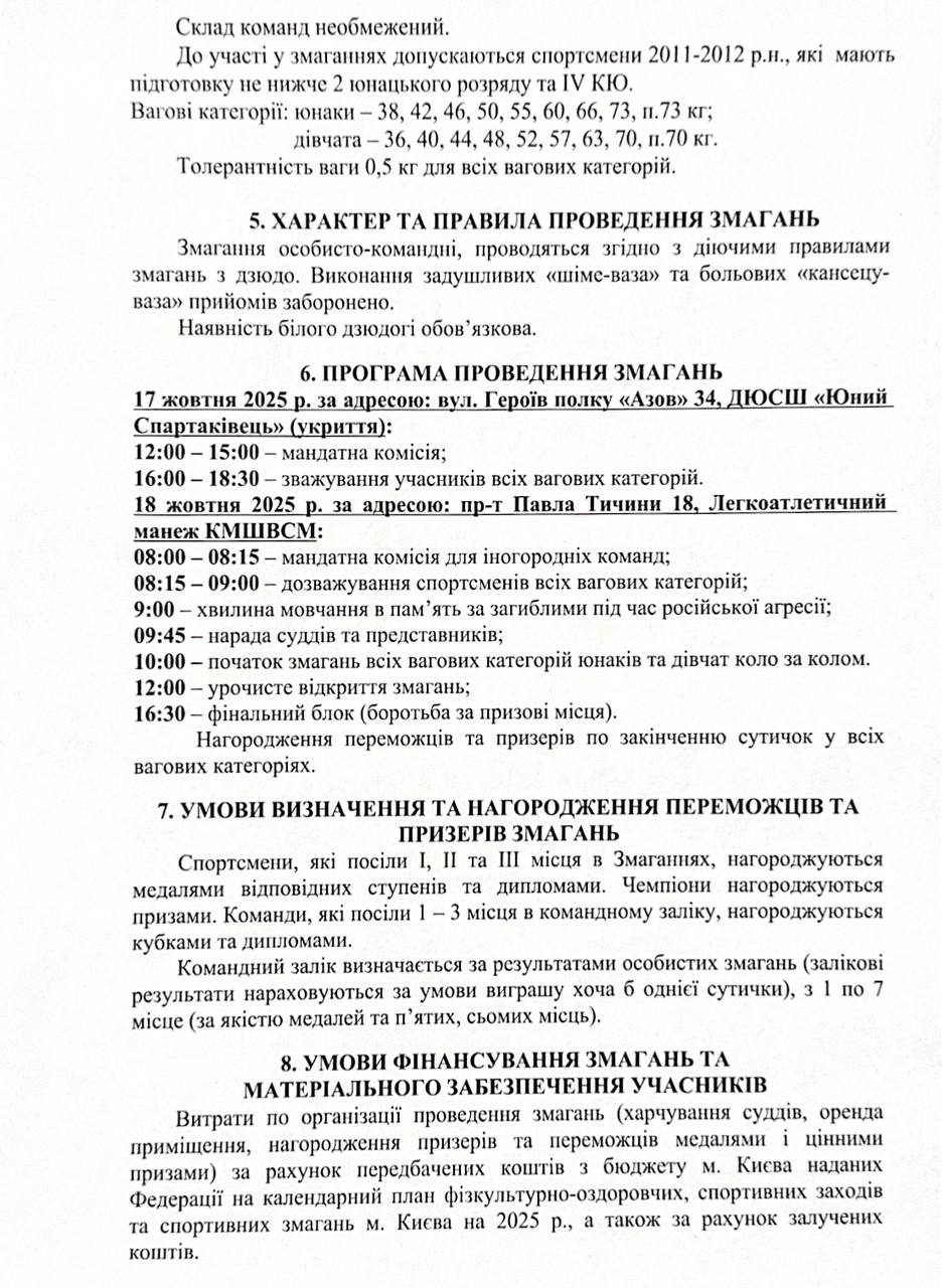 Відкритий чемпіонат міста Києва з дзюдо серед юнаків та дівчат до 15 років (2011-2012 р.н.) відбудеться 17-18 жовтня 2025 року.